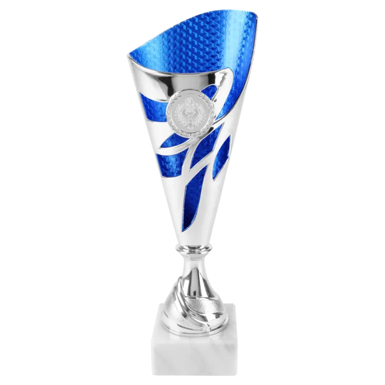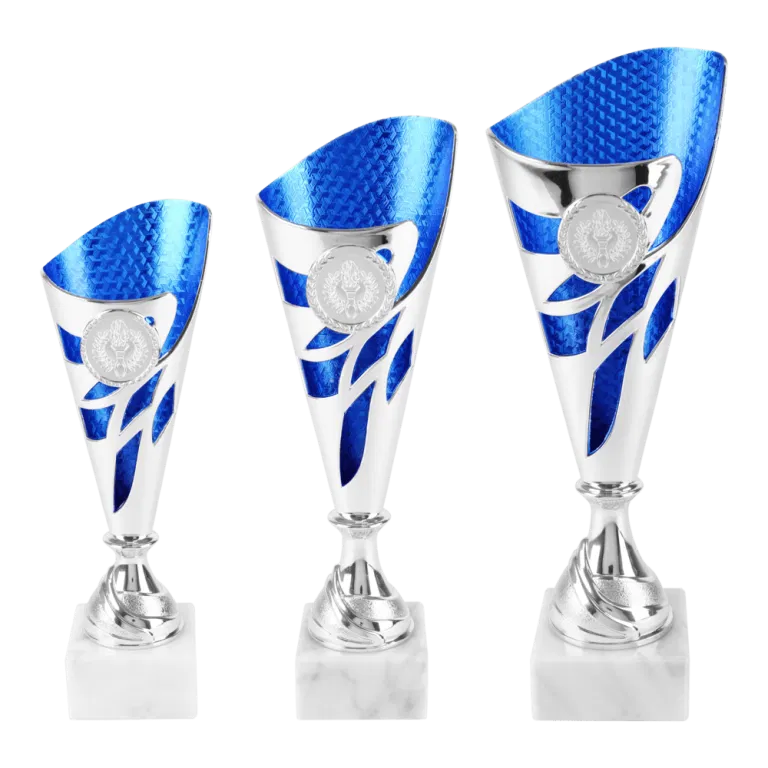 Zilverkleurig trofee blauw. De trofee is mooi bewerkt en is te gebruiken voor iedere hobby of sport. Op de voet is er plaats voor een goud of zilverkleurige label met tekst. De beker is verkrijgbaar in 3 verschillende afmetingen.
